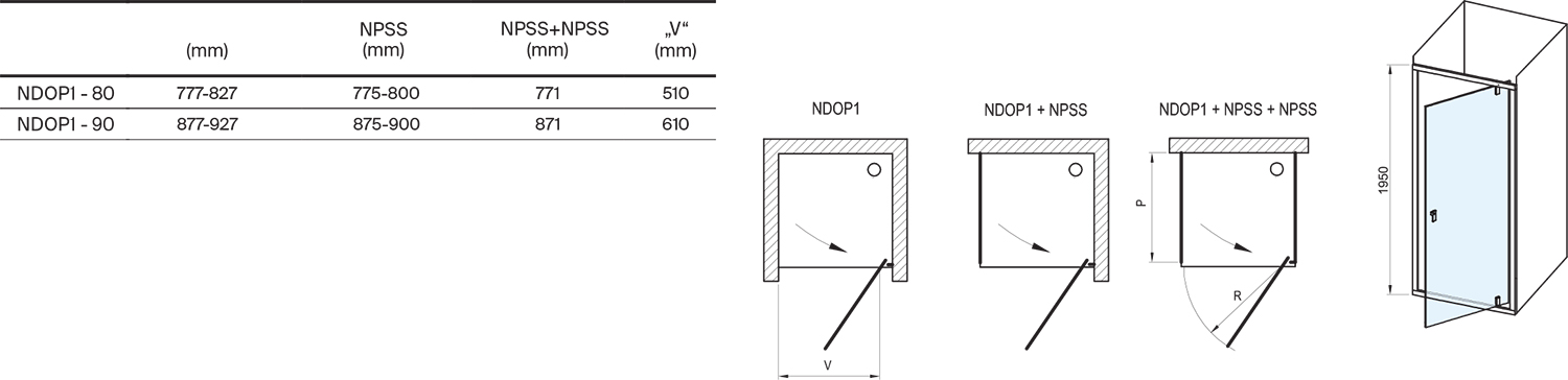 Výrobok sa skladá z jedného rovného otočného dielu, ktorý tvorí dvere. Otočením výrobku o 180° získate ľavý alebo pravý variant otvárania dverí. Montuje sa do obloženého rohu kúpeľne (ideálne do vymurovanej niky alebo v kombinácii s pevnou stenou NPSS) na vaničky Ravak Perseus Pro, Perseus Pro Flat, Perseus Pro Chrome, Gigant Pro, Gigant Pro Flat, Gigant Pro Chrome alebo priamo na podlahu so zabudovaným odtokovým žľabom či podlahovým vpustom. Kombináciou s dvoma pevnými stenami typu NPSS vytvoríte sprchový kút v tvare „U“. Použitím rozširovacieho profilu NNPS možno výrobky rozšíriť o 20 mm, preto sa dokonale prispôsobia stavebným nerovnostiam až o 4 cm na každej strane.