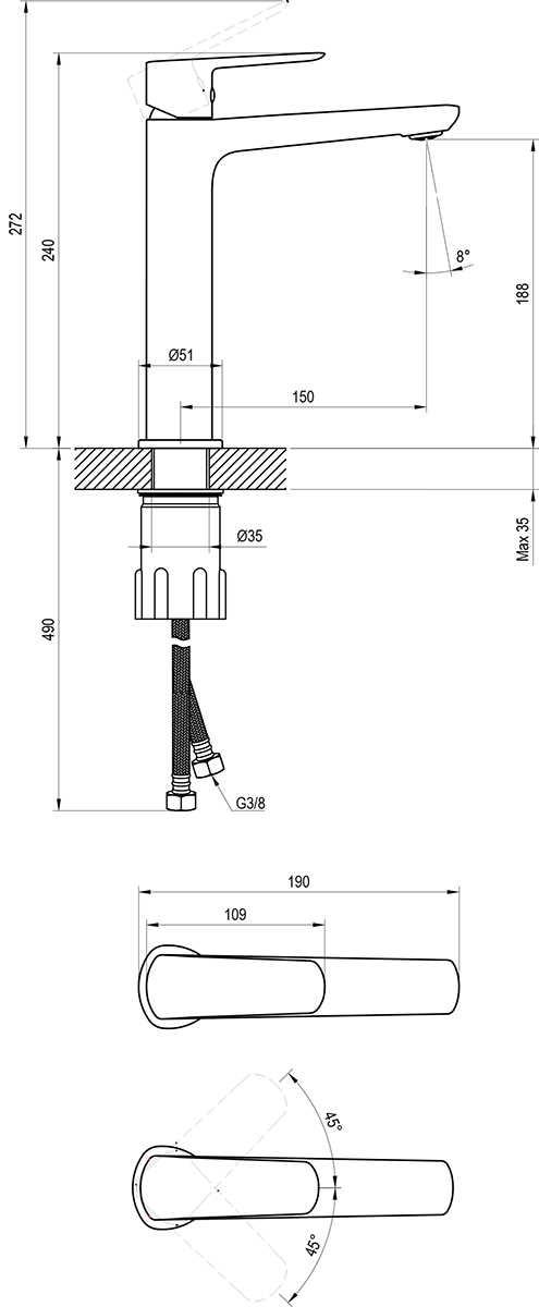 • Pripojovacie hadičky: flexibilné 450 mm, priemer G3/8