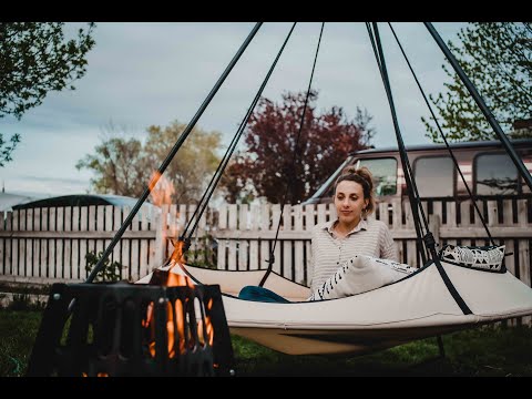 Přenosná kruhová rodinná houpací síť Hangout Pod, poskytující pohodlí a dokonalý úkryt před světem na vaší zahradě, na cestách nebo doma.