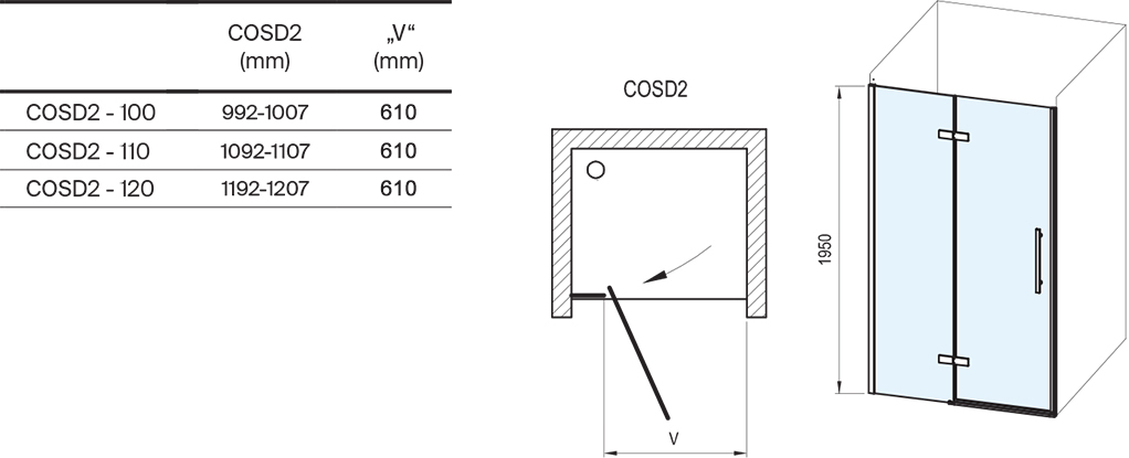 Otočením výrobku o 180° získáte levou nebo pravou variantu otevírání dveří. Výrobek se montuje do vyzděné niky, nebo v kombinaci s pevnou stěnou COPS, na lité vaničky Gigant Pro, Gigant Pro Chrome nebo přímo na podlahu se zabudovaným odtokovým žlabem či podlahovou vpustí. Vzpěra je součástí balení. Použitím nastavovacího profilu CONPS lze sprchové dveře rozšířit o 25 mm (na straně umístění magnetu a je využitelný pouze při instalaci v nice).