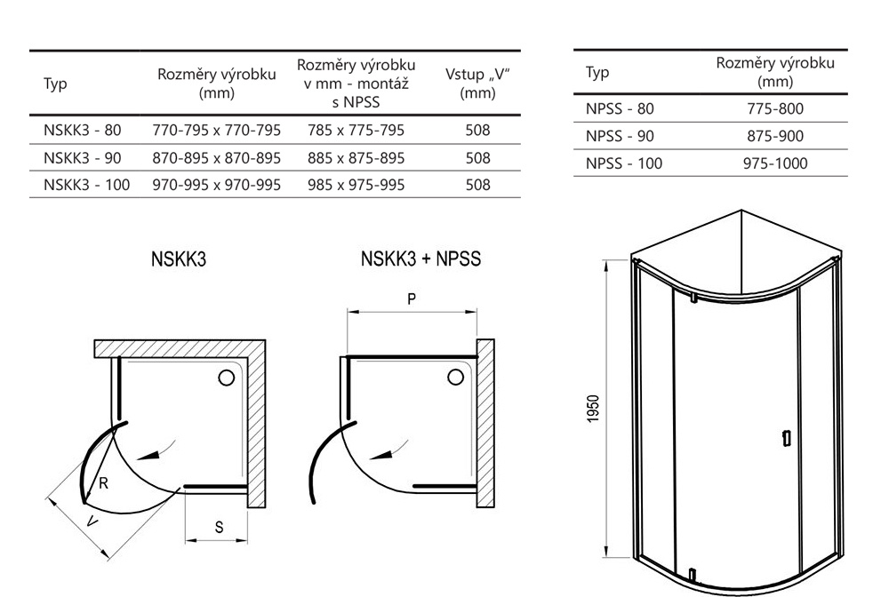 Výrobek tvoří dva pevné rovné díly a jeden ohýbaný díl jako otočné dveře. Otočením výrobku o 180° získáte levou nebo pravou variantu otevírání dveří. Montuje se do obloženého rohu koupelny na vaničky Ravak Ronda, Elipso, Elipso Pro, Elipso Pro Flat, Elipso Pro Chrome nebo přímo na podlahu se zabudovaným odtokovým žlabem či podlahovou vpustí. Pokud nedisponujete vyzděným rohem, příčku můžete nahradit pevnou stěnou typu NPSS. Pomocí nastavovacích profilů NNPS se výrobek umí přizpůsobit stavebnímu otvoru až o 4 cm na každé straně.